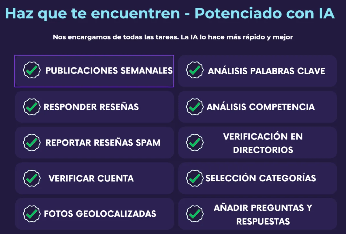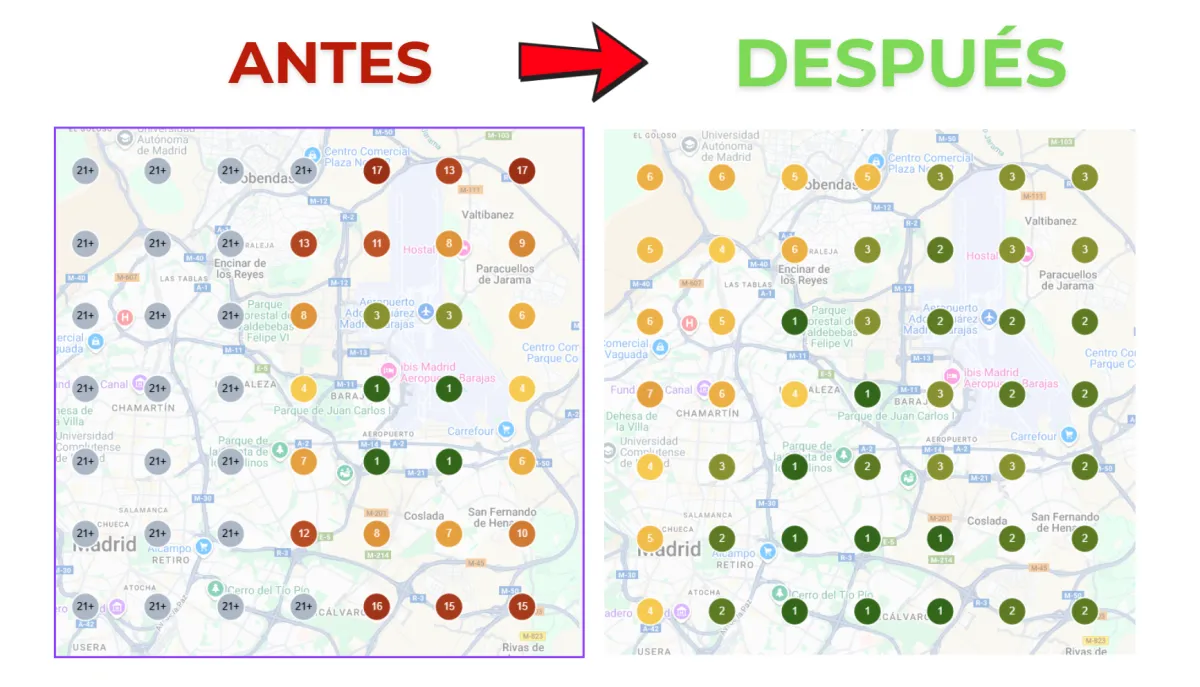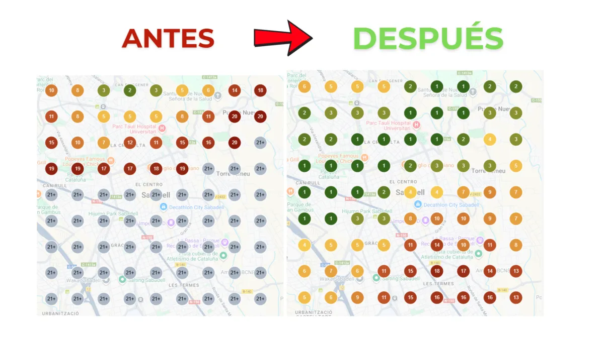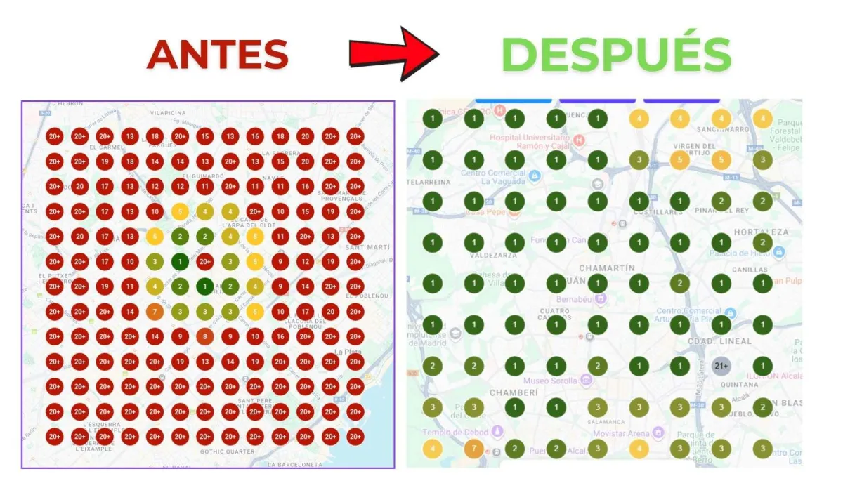 Este es el error más típico que cometen los dueños de negocios. Cuando buscas tu propia ubicación, Google te muestra lo que quieres ver. Muévete a 1 kilometro de tu negocio y desaparecerás completamente. Nuestro servicio se centra en llevarte nuevos clientes que están a 1-5 kilometros de tu negocio a que vayan al tuyo,